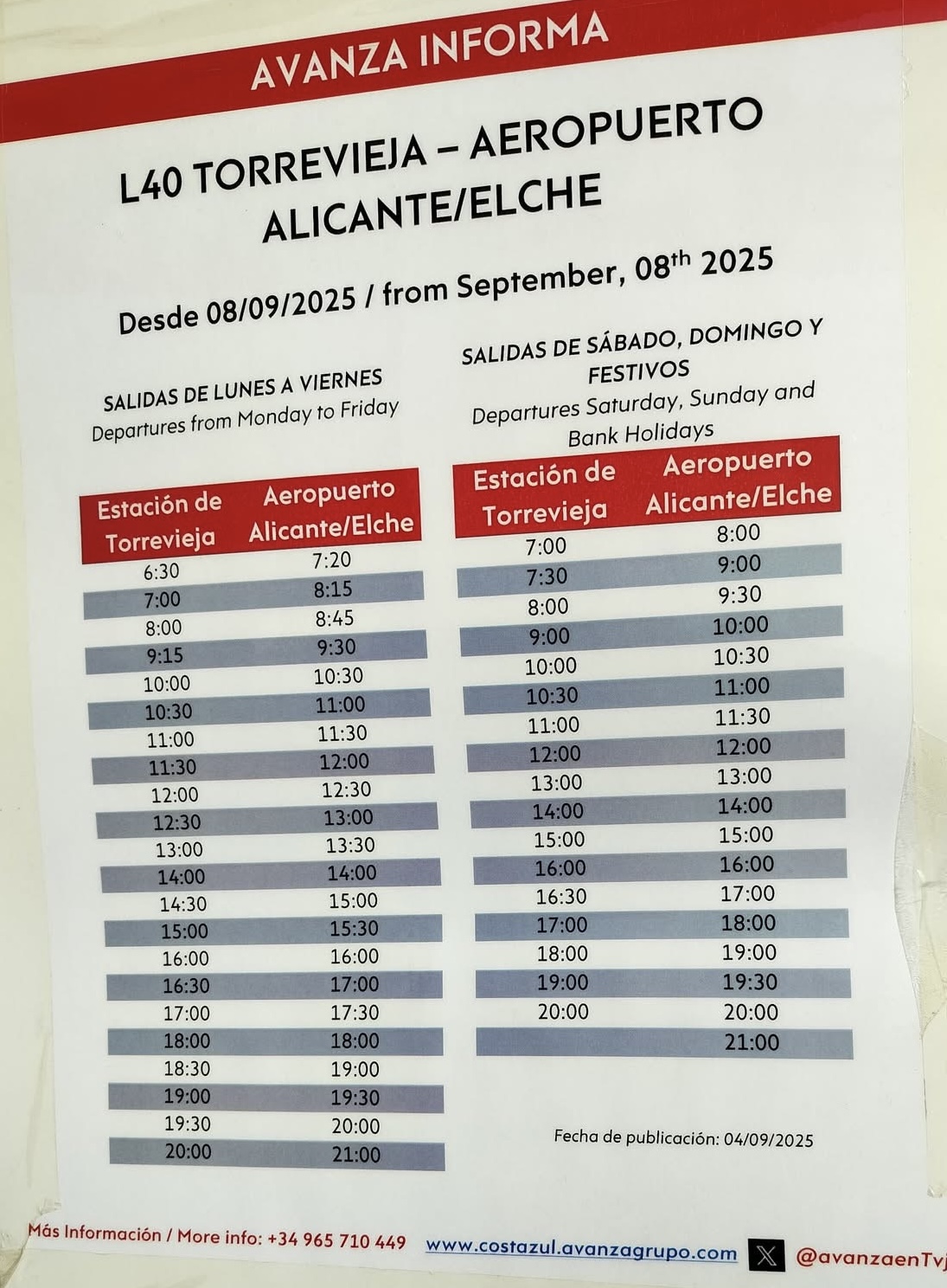 Bussen gick tidigare ojämna timmar från Torreiveja till El Altet och jämna timmar från flygplatsen till Torrevieja. Sedan sommaren 2024 har tiderna dock utökats. Se nuvarande tider i tabeller nedan.