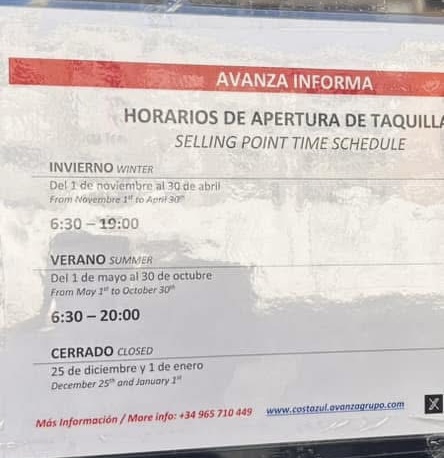- I Torrevieja i luckan vid busstationen från 20 minuter före avgång. OBS! Endast kontant betalning! (De tar inte kortbetalning).