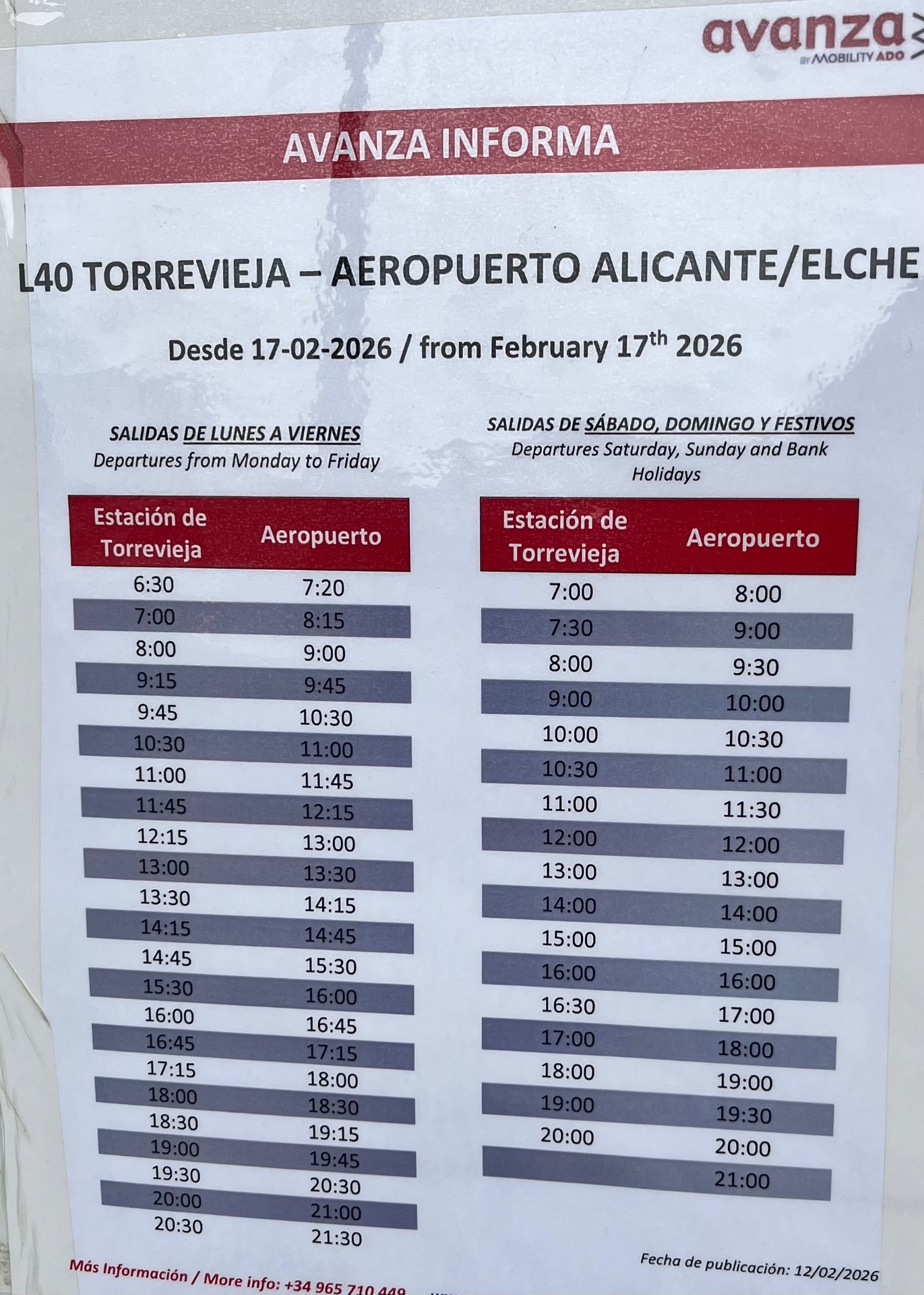 Bussen gick tidigare ojämna timmar från Torreiveja till El Altet och jämna timmar från flygplatsen till Torrevieja. Sedan sommaren 2024 har tiderna dock utökats. Se nuvarande tider i tabeller nedan.